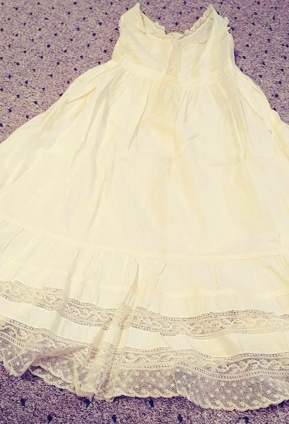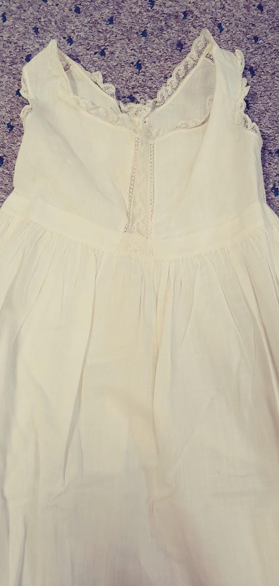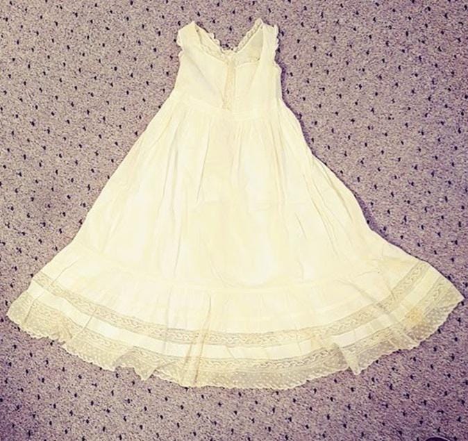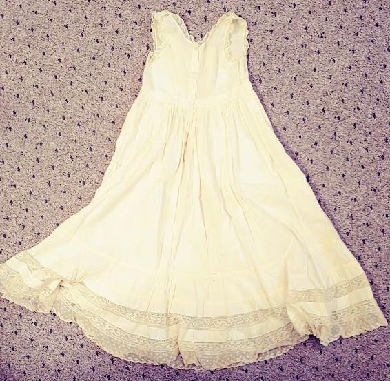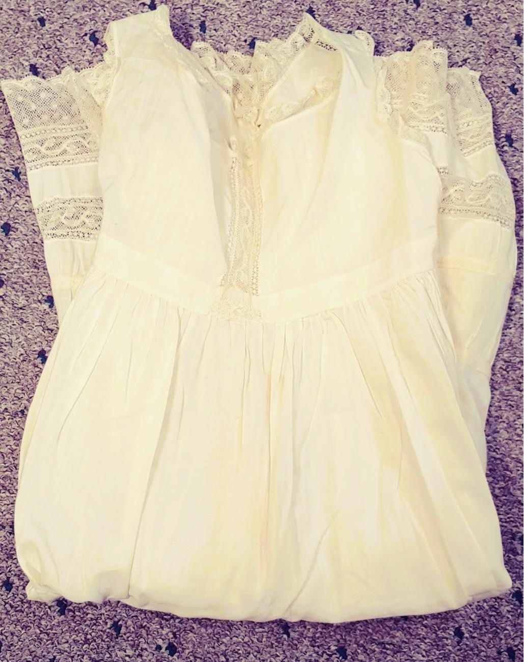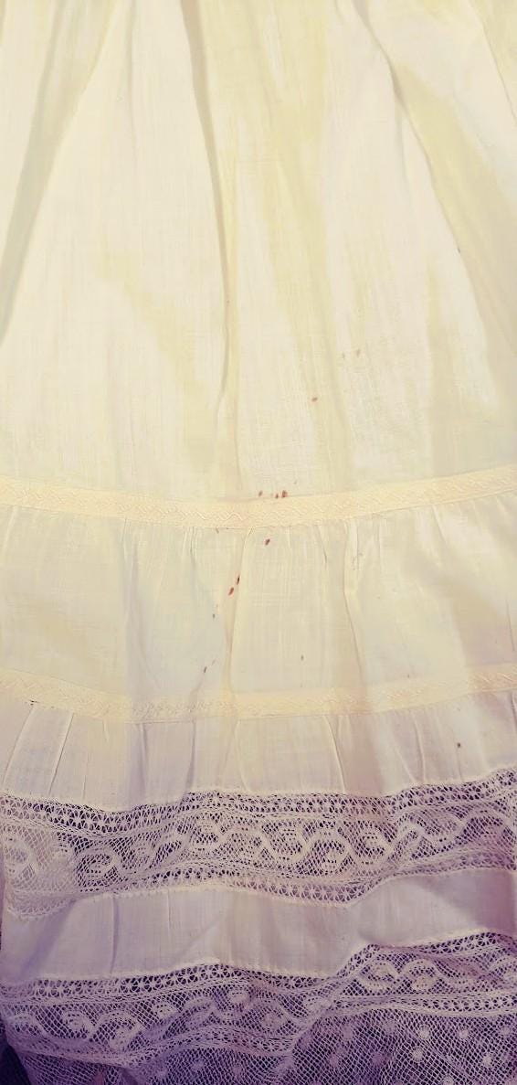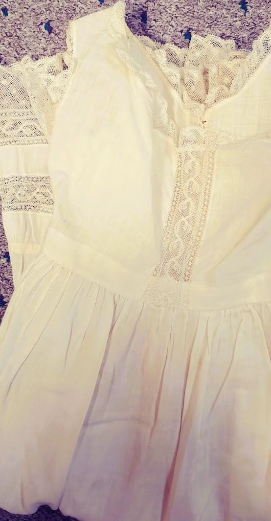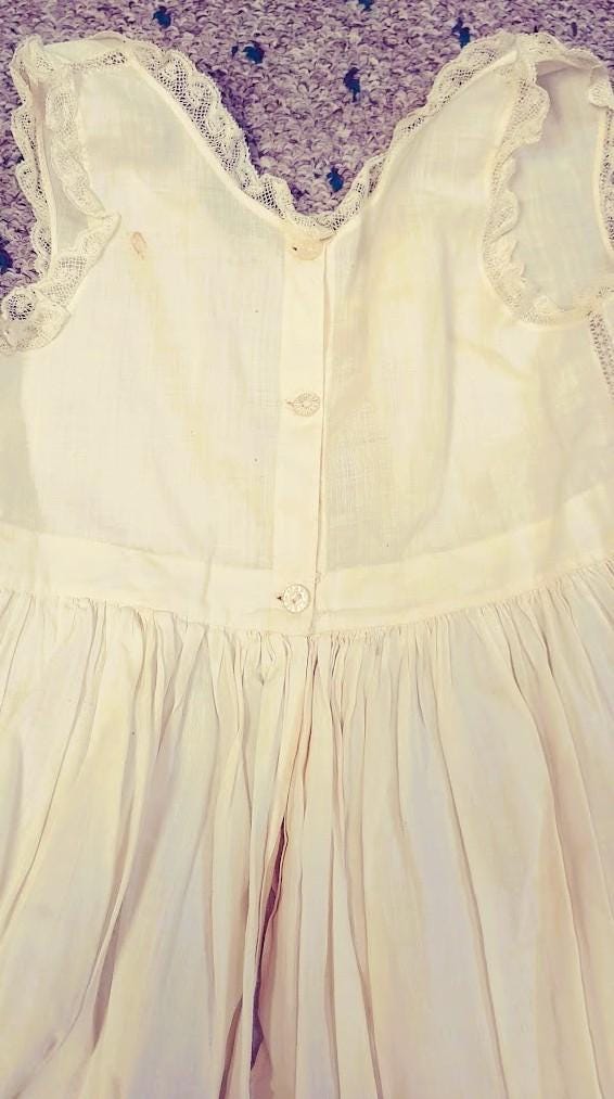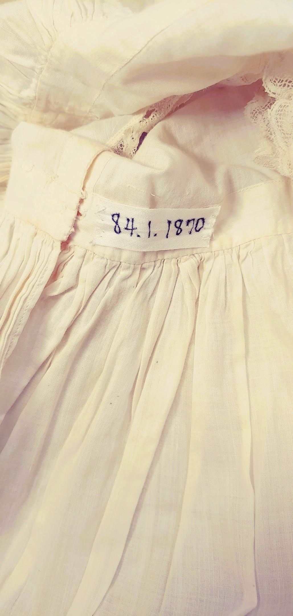 The items I will be listing from this estate were purchased from another buyer. This gown is lovely and as the photos show there are some brown spots on the back of the gown. I did not attempt to treat these due to their age but someone could possibly remove these spots with knowledge of treating antique fabrics.In remarkably good condition. There is a label sewn inside that say 84.1.1870. These were the property of a museum at some point. This gown is 7" from shoulder to shoulder. 26" from shoulder to hem and 9" across the bodice. It has beautiful antique lace trim. Please message if you have questions and thanks for looking!