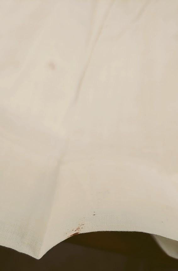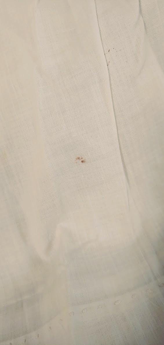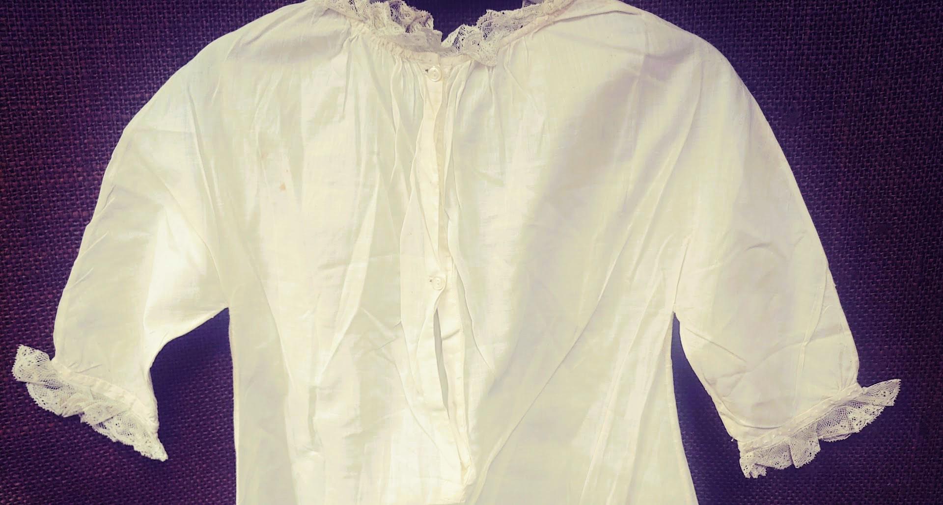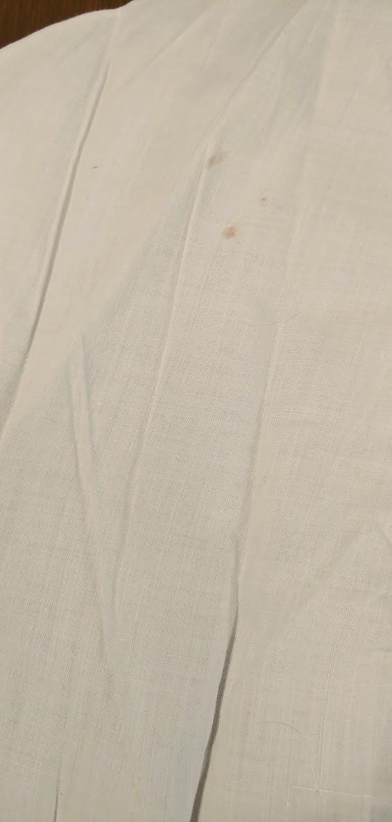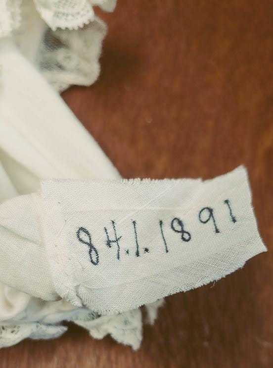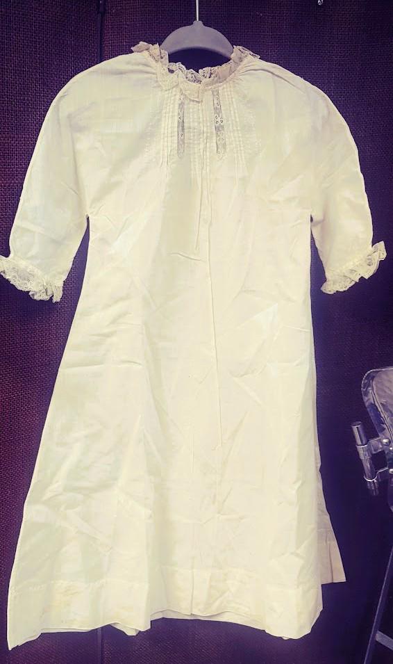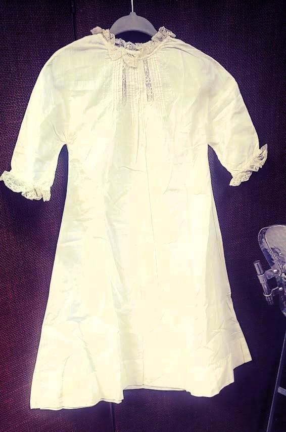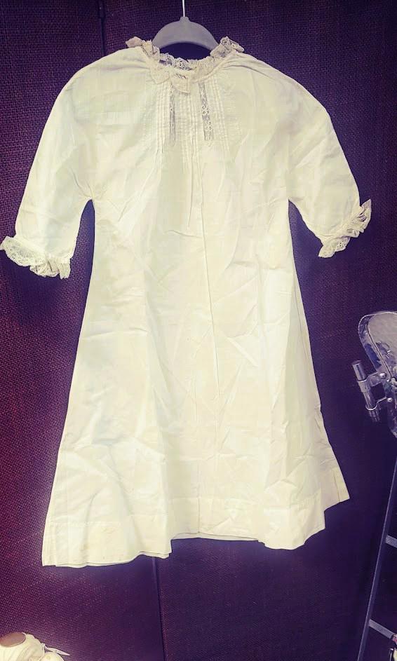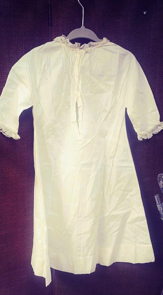 The items I will be listing from this estate were purchased from another buyer. This gown is lovely and as the photos show there are brown spots. I did not attempt to treat these due to their age but someone could possibly remove these spots with knowledge of treating antique fabrics.In remarkably good condition. There is a label sewn inside that say 84.1.1891. Some of these have been property of a museum at some point. This gown is 9" from shoulder to shoulder. 25" from shoulder to hem and 11" across the bodice. It has embroidery and pleated bodice. Please message if you have questions and thanks for looking!
