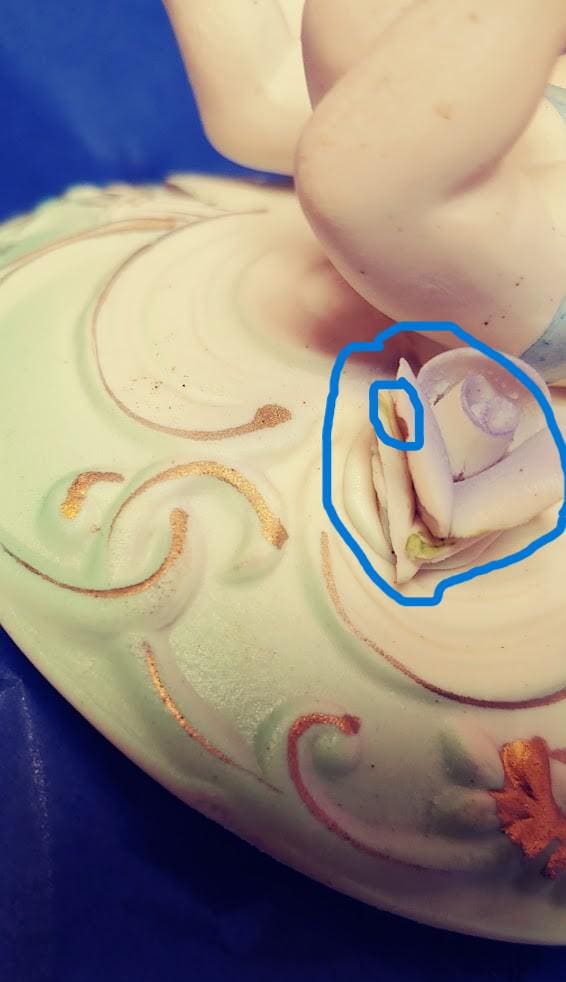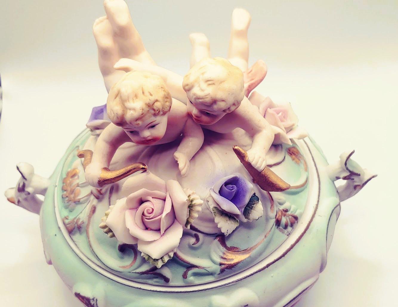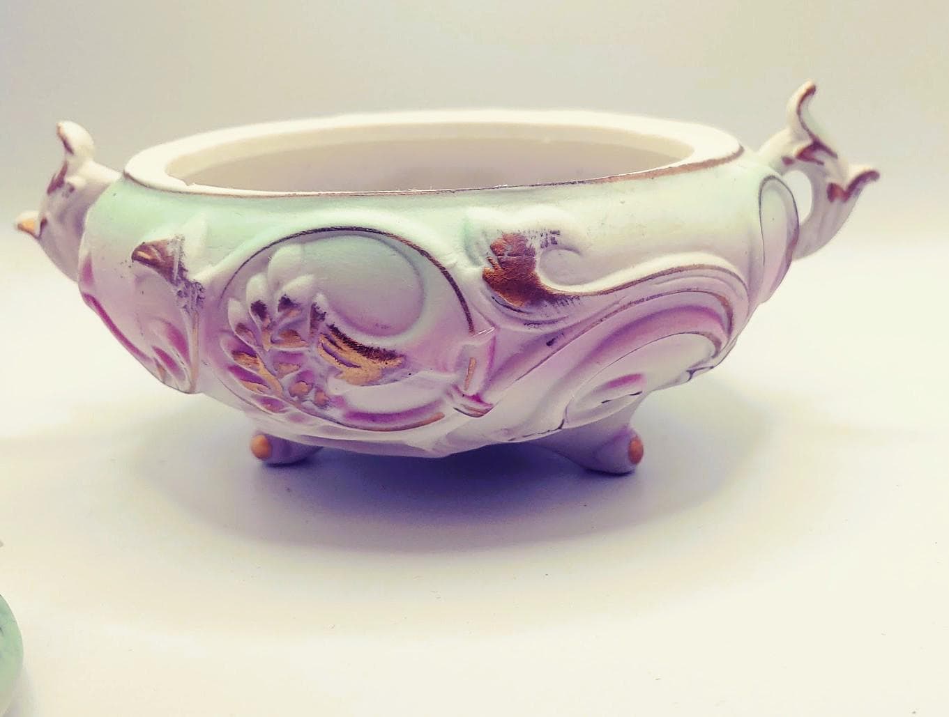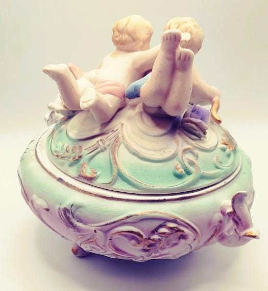 This is a beautiful Bisque Porcelain Trinket/Candy Dish from the 1950's. No stickers or manufacturer marks but matches Norleans. As with any bisque pieces there are some chips and I have pictured and circled them in the last three photos. The inner chip on rim is not visible with lid on and the other breaks on the florals are not real noticeable and I did not notice them until I rinsed the item when I lightly cleaned it. Has been covered and stored for years and was from an estate. Even with the flaws the coloring and details are amazing. Please message if you have questions and thanks for looking!