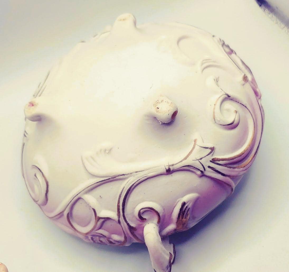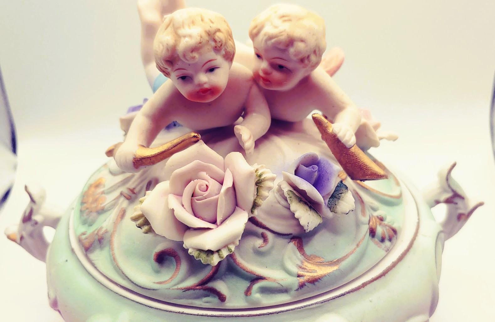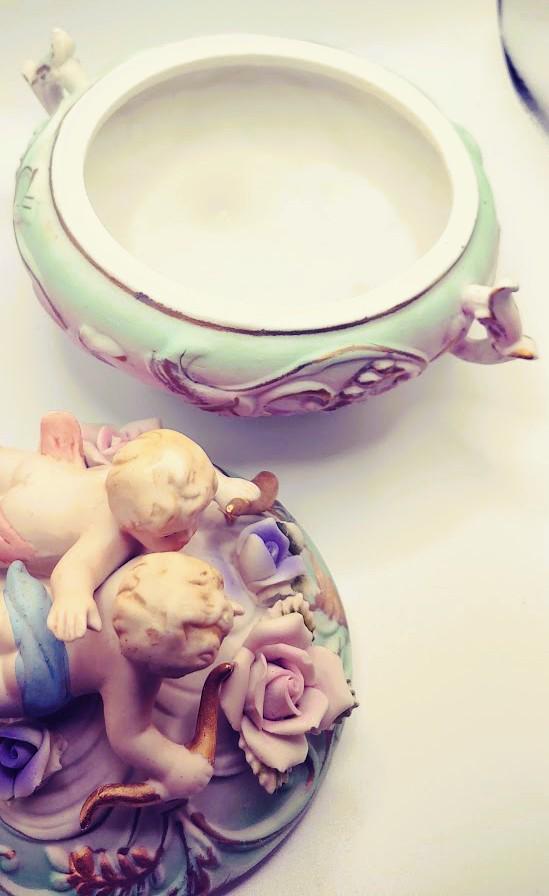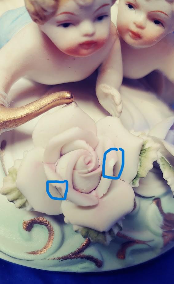 This is a beautiful Bisque Porcelain Trinket/Candy Dish from the 1950's. No stickers or manufacturer marks but matches Norleans. As with any bisque pieces there are some chips and I have pictured and circled them in the last three photos. The inner chip on rim is not visible with lid on and the other breaks on the florals are not real noticeable and I did not notice them until I rinsed the item when I lightly cleaned it. Has been covered and stored for years and was from an estate. Even with the flaws the coloring and details are amazing. Please message if you have questions and thanks for looking!