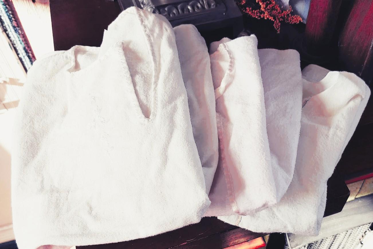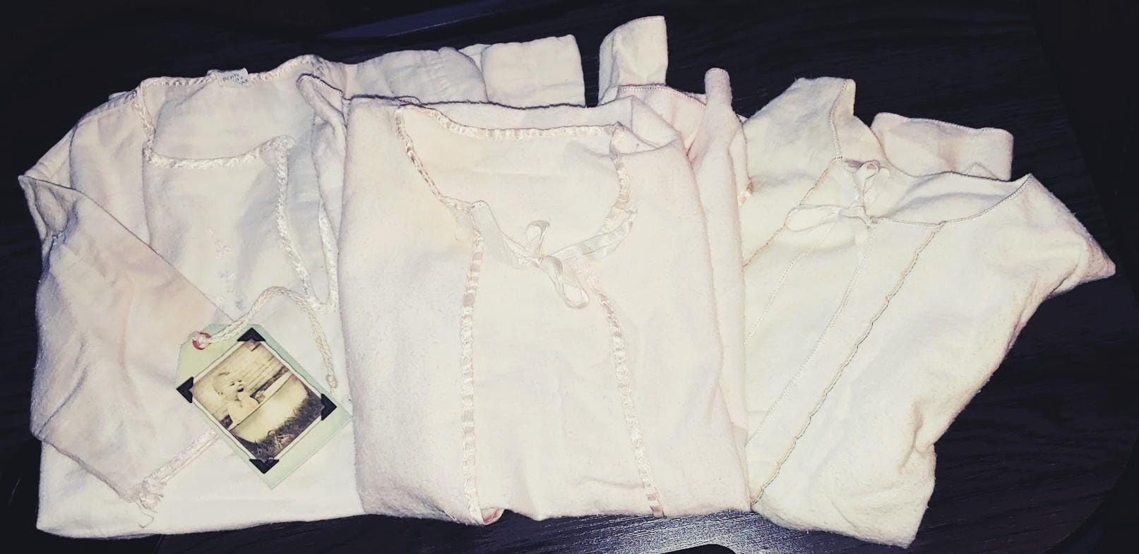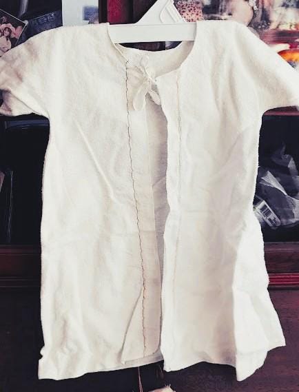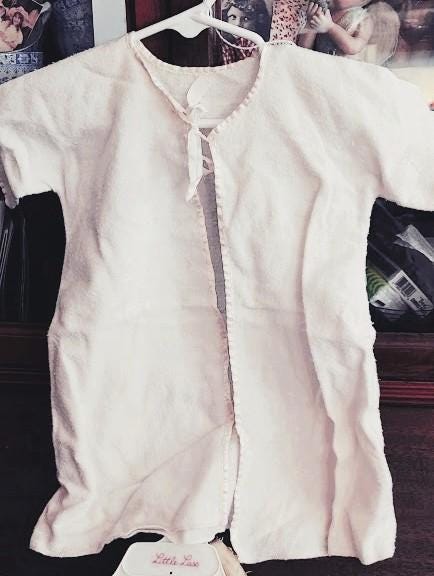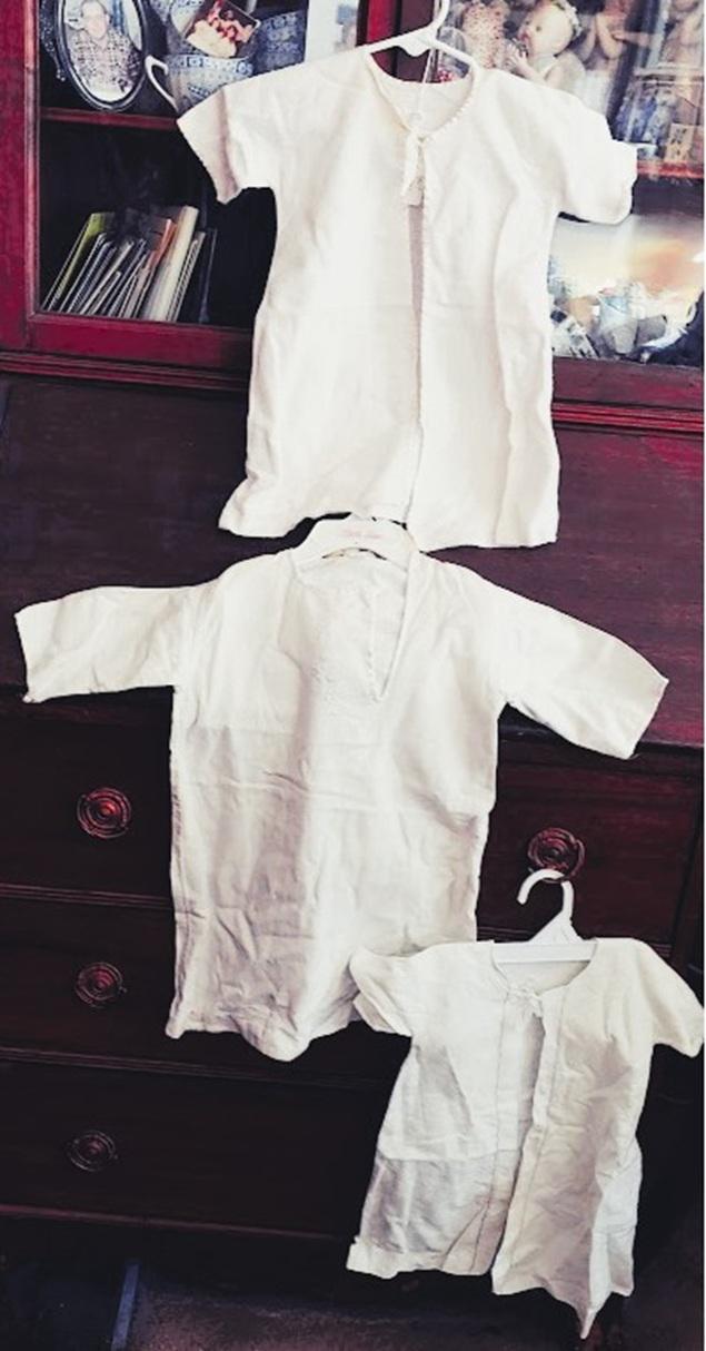 Measuring across shoulders 8-9" From shoulder to hem 15"-19" The two smaller gowns are handmade and tie at the neck. The larger gown has a tag "Petite Baby Wear" and a missing button that holds the neckline closed. As with older vintage clothing these are not perfect and will be subject to wear areas and stained or discolored from decades of storage. I sell vintage/antique baby clothing to dollmaker's and have many happy customers. All clothing is soaked and rinsed multiple times to remove scents. Any stained areas left can be hand treated at your discretion. The pictured gowns were folded and in a poly bag before pictures were taken so will need pressing. Please message if you have questions and thanks for looking!