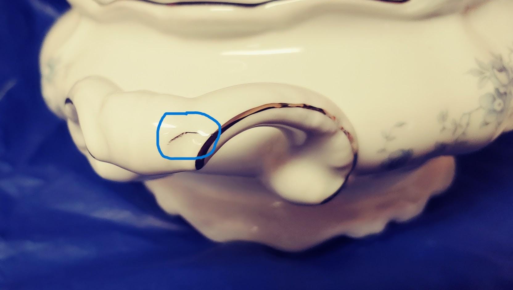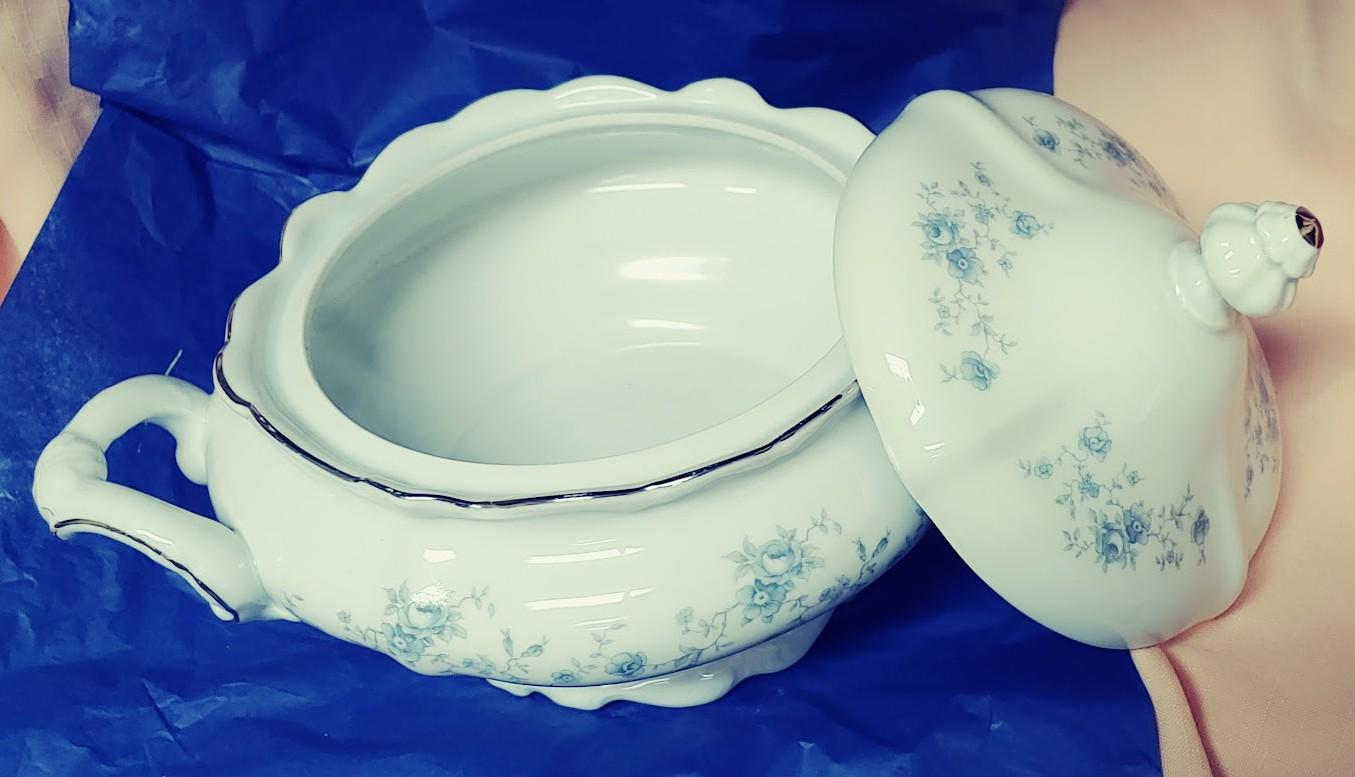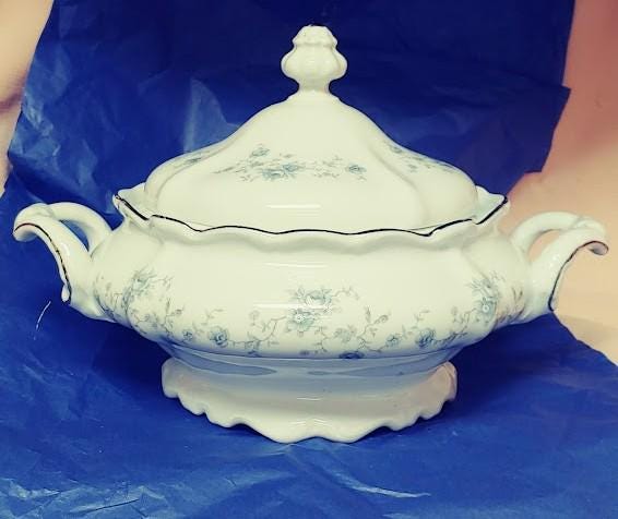 Beautiful Johann Haviland Bavaria, Germany Covered Vegetable/Casserole Dish. About 11" wide from handle to handle 7 1/16" diameter X 4" tall w/o cover and 7.5" with lid on. Platinum trim is good but there is a manufacturer error on one handle where the platinum is smeared. (see photo) This has been stored for decades and looks like it was rarely used. Please message if you have questions and thanks for looking!