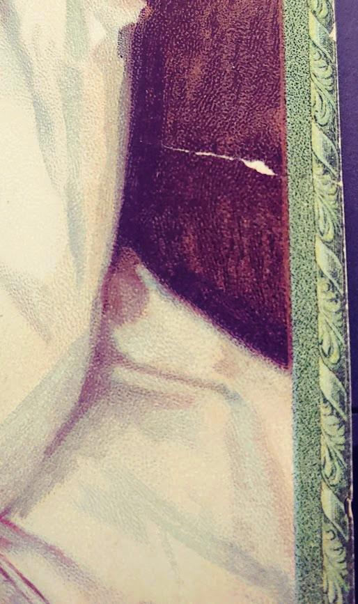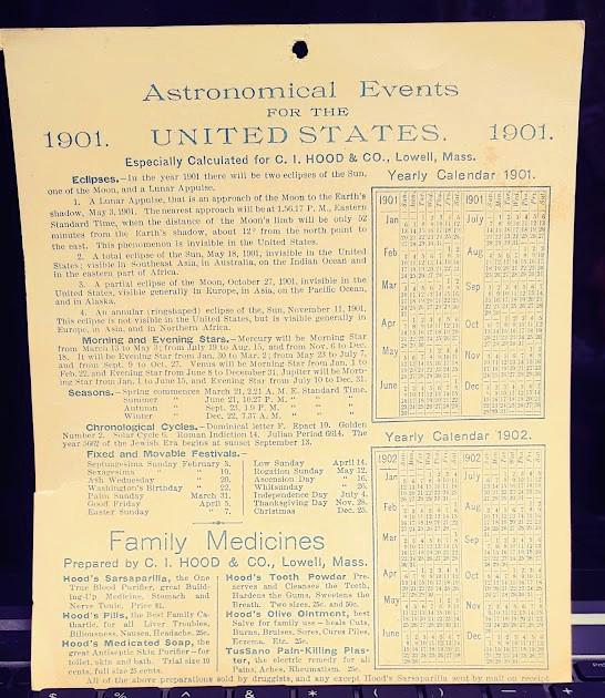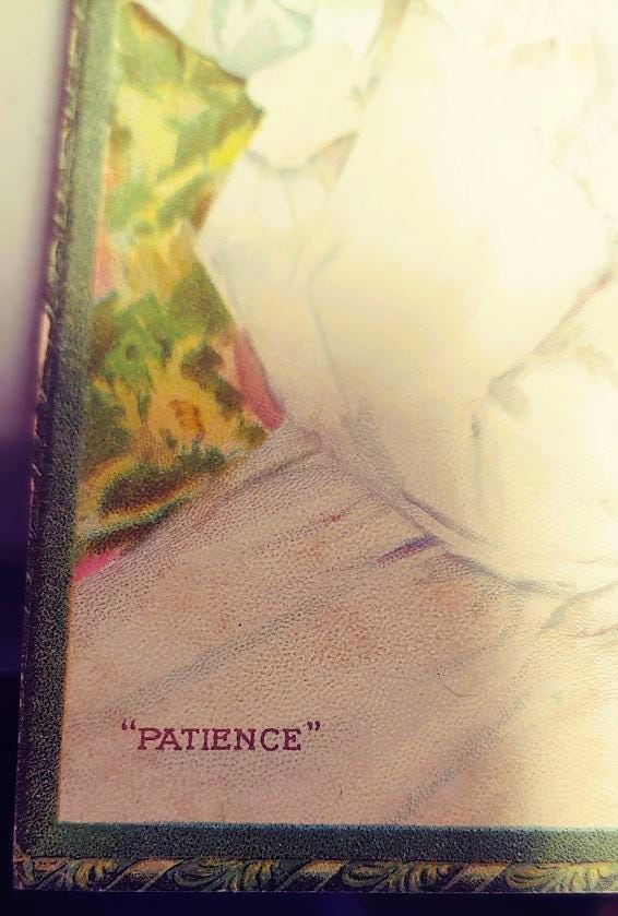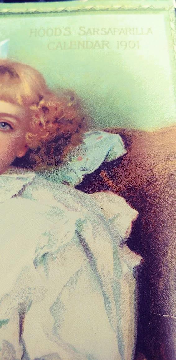 This is an advertising card for Hood's Sarsaparilla with a 1901 -02 calendar on back. Picture is titled "Patience" and Copyright is 1900. It is about 6 1/2" X 7 9/16". Please note the photos of a small tear on the right side of the card and a wear spot on the lower middle of front on the border and a small hole at the top for hanging. It still has nice colors and it's a sweet picture.