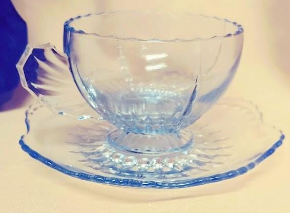 New Martinsville Glass Radiance Ice Blue Winged handle cup and saucer.
