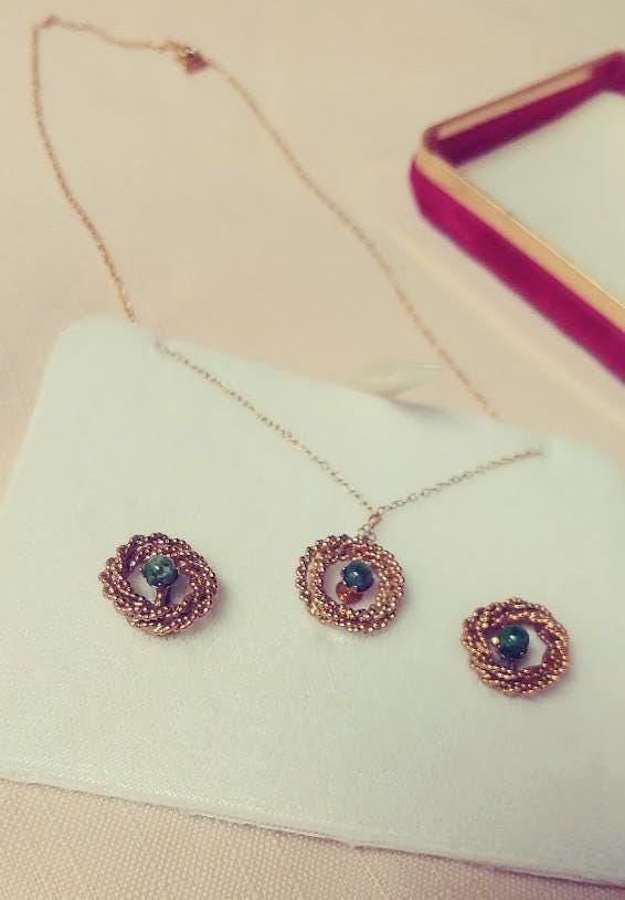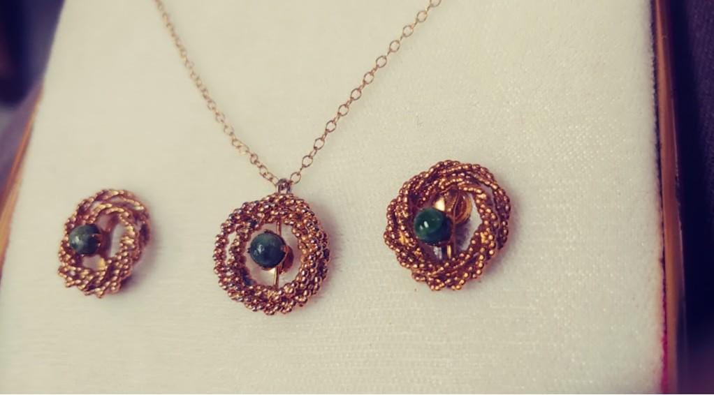 The stone is a variegated green color. The back of the necklace says 12kt GF. They are in the original box and do not appear to have been worn. The necklace chain is about 15" long. Please message if you have questions and thanks for looking!