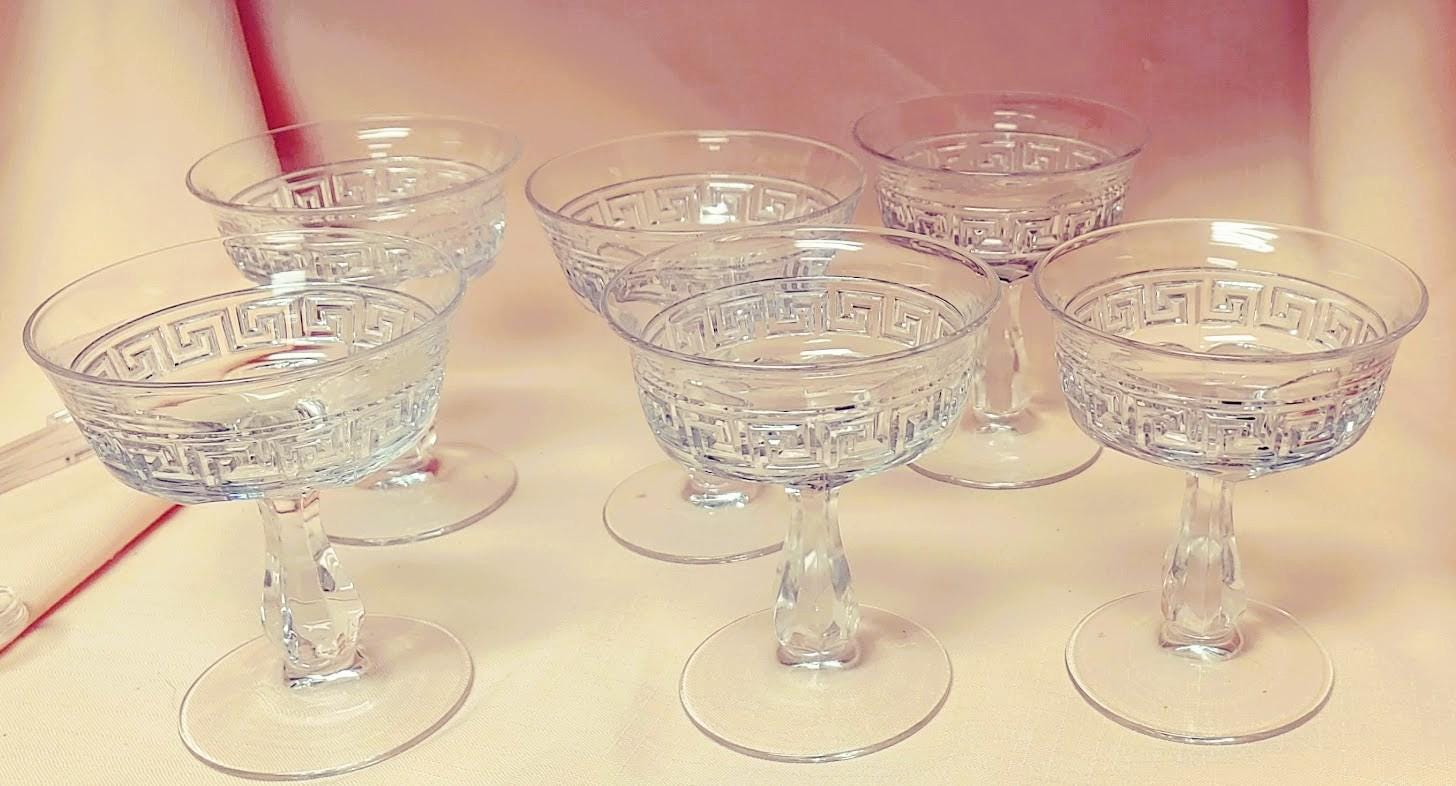 This treasure is from an estate and has been packed away for decades. This is marked Heisey. In the Greek Key pattern (1911-1938) 4 1/2" Champagne/Tall Sherbet. Pricing is for a single glass. Please message if you have questions and thanks for looking!